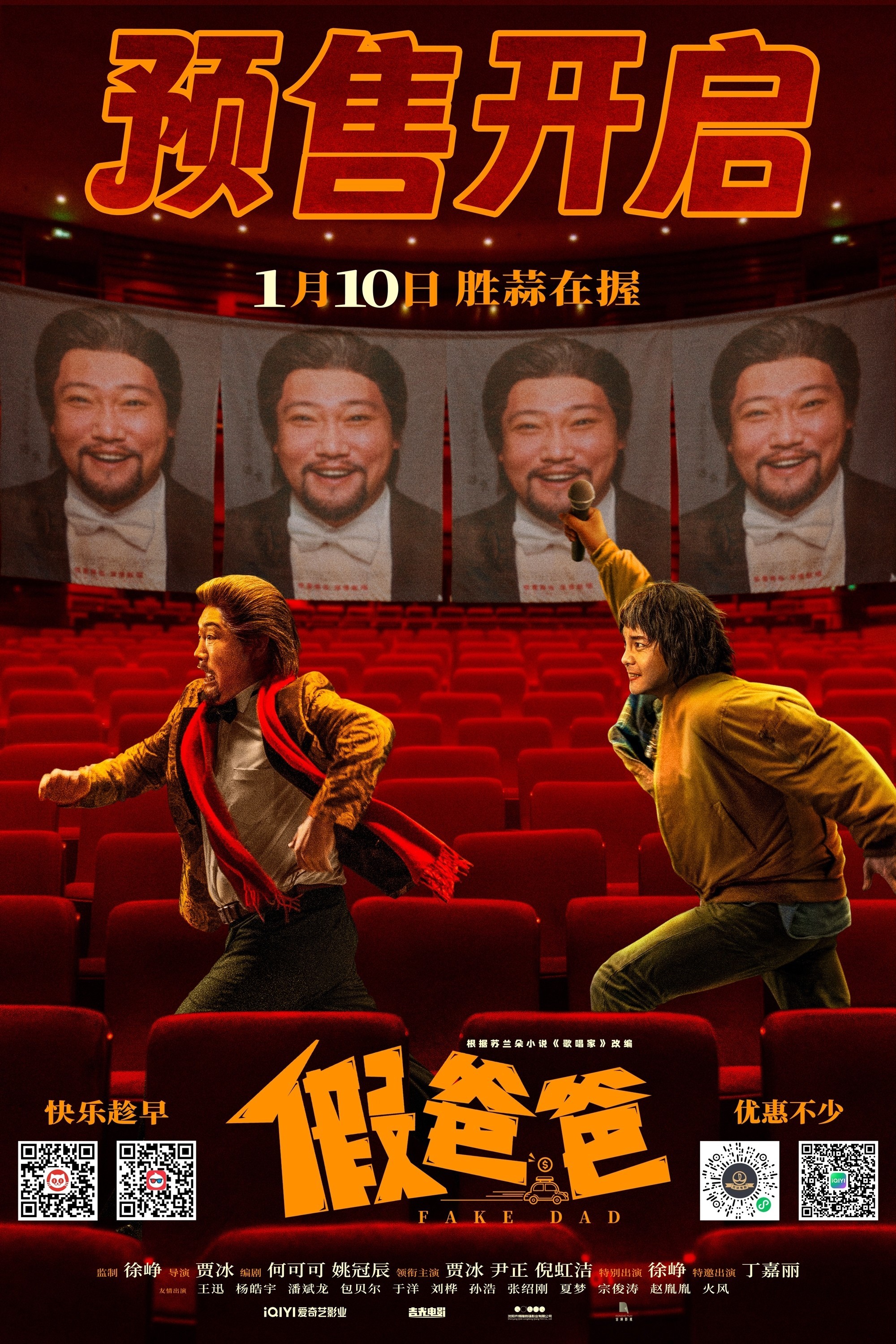今日,由爱奇艺出品的喜剧电影《假爸爸》已正式开启预售,并发布了“胜蒜在握”版预售预告和“抢笑新春”版预售海报,紧张的节奏和动感的画面全方位呈现新春喜剧氛围,趣味“抢票”小剧场和你追我赶的搞钱父子档也让许多观众沉浸式地体验新鲜有趣的影片看点。影片讲述了王春生(贾冰饰)和杨十月(尹正饰)这一对假父子为了赚到30万,一起踏上了一段令人啼笑皆非的走穴之旅的故事。电影《假爸爸》由徐峥监制,贾冰导演,何可可、姚冠辰担任编剧,贾冰、尹正、倪虹洁领衔主演,徐峥特别出演,丁嘉丽特邀出演,王迅、杨皓宇、潘斌龙、包贝尔、于洋、刘桦、孙浩、张绍刚、夏梦、宗俊涛、赵胤胤、火风友情出演。影片将于1月10日全国上映。